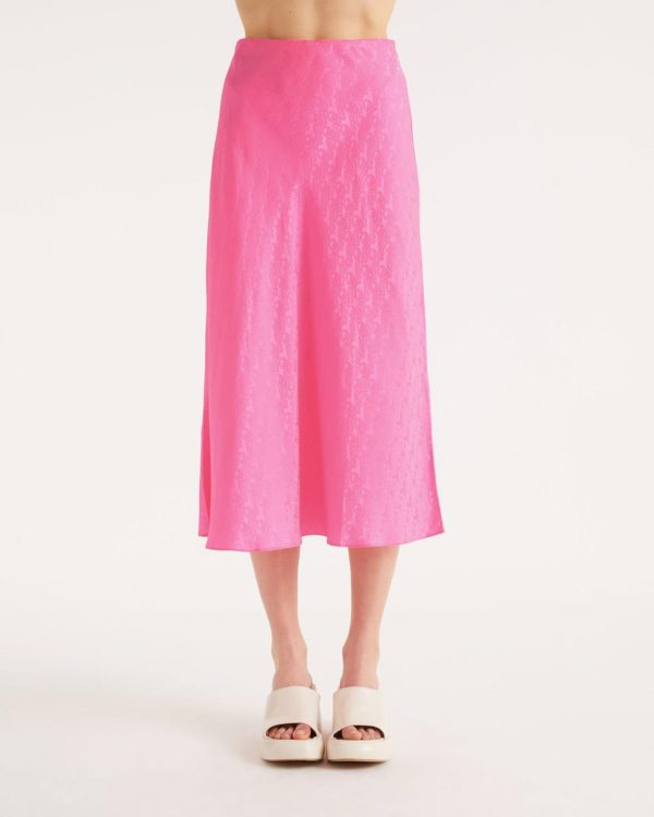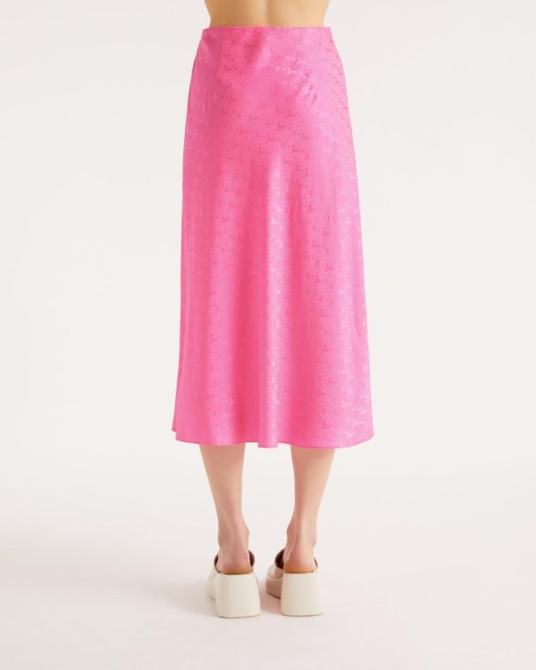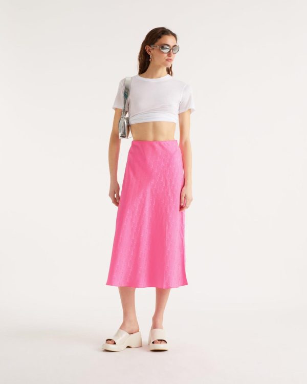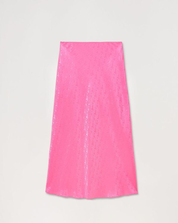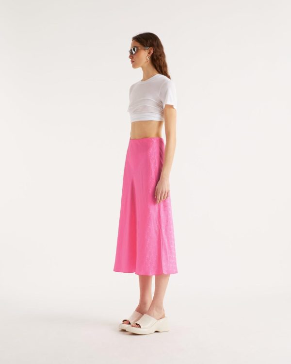 Satin de soie léger et jacquard signature « FUTURE » pour la jupe Carmen fluide mi-longue. Pièce incontournable du vestiaire féminin, elle dévoile un tombé parfait, légèrement évasé sur le bas.