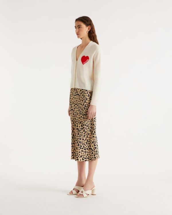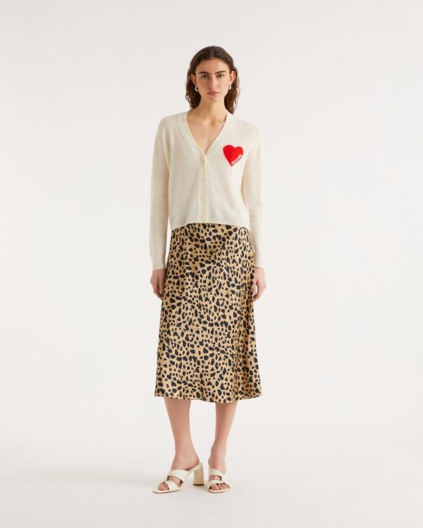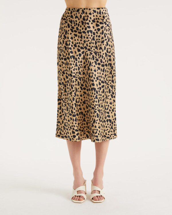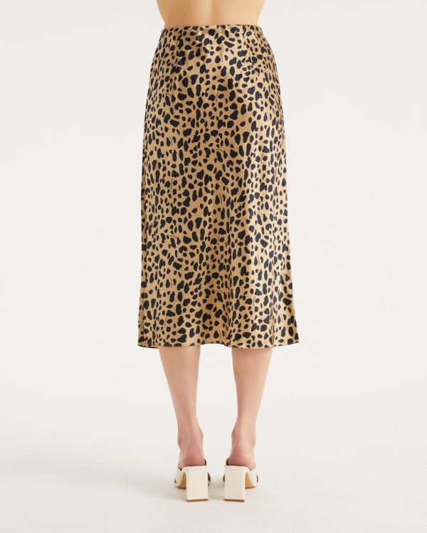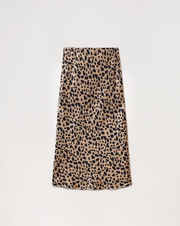 La jupe Gina mi-longue en satin de soie brillant et soyeux s’adopte de jour comme de nuit, avec un caraco léger comme une maille moelleuse.Munie d’une taille élastiquée, elle adopte un imprimé animal naturel et dévoile un drapé fluide évasé.