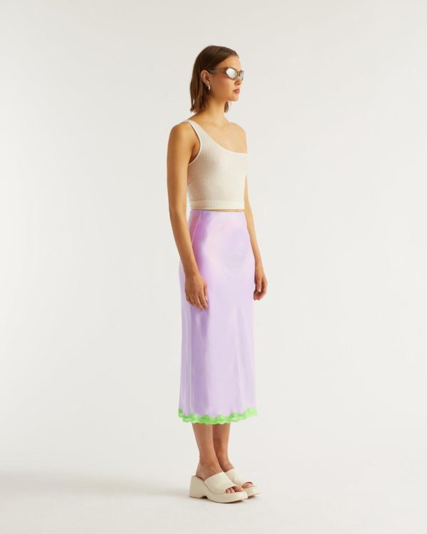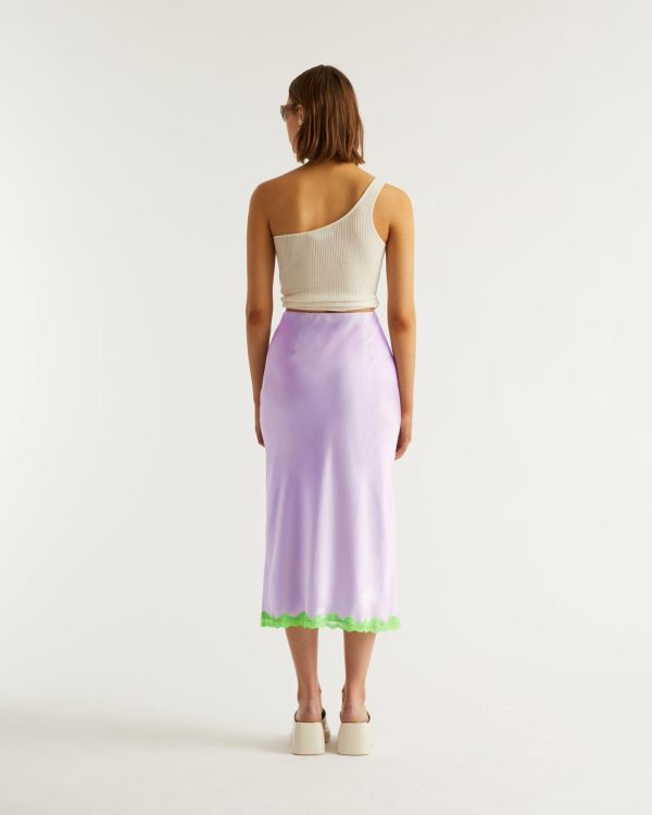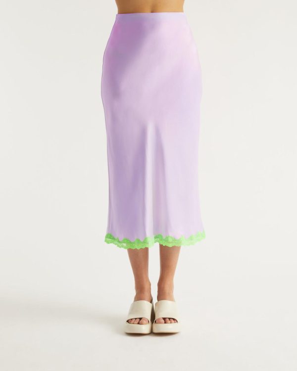 En satin de soie léger, brillant et soyeux, la jupe Rebecca mi-longue dévoile un tombé fluide légèrement évasé et un bord en dentelle constrastée sur le bas.