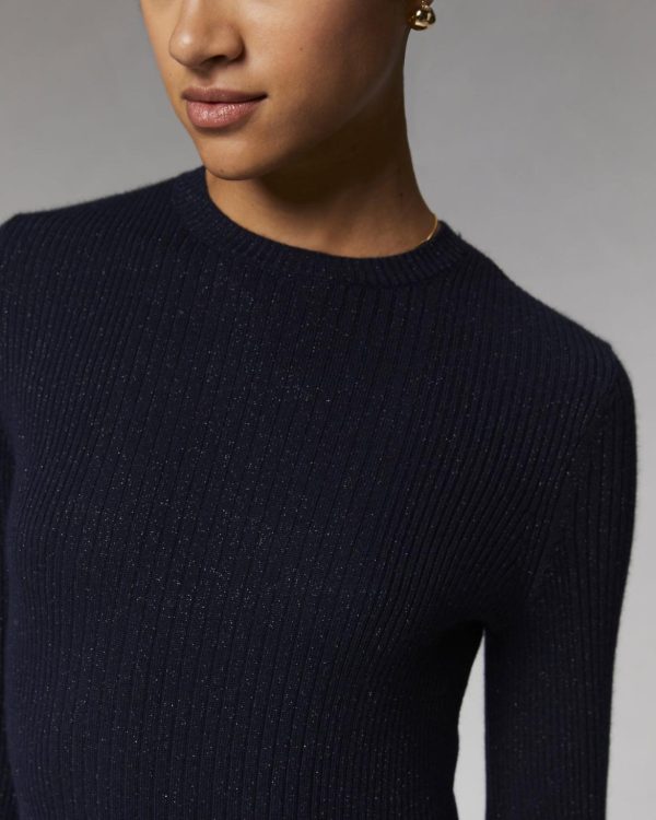 L’indispensable robe courte du vestiaire féminin est revisitée dans une version ajustée en maille côtelée et métallisée. En laine mérinos certifiée RWS (Responsible Wool Standard) et en lurex, elle dévoile un col rond et des manches longues.