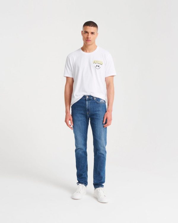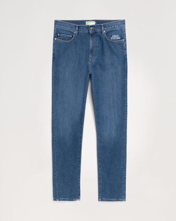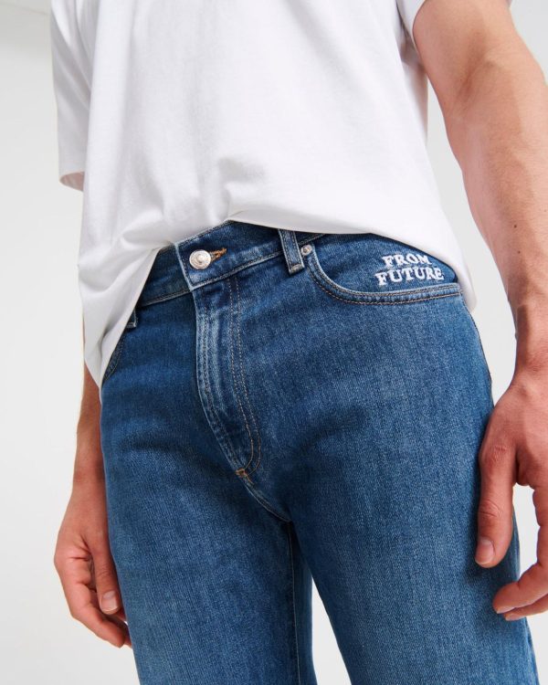 Tout savoir sur Jacob : Jean slim fit. Broderie FROM FUTURE semi-cachée au niveau de la poche gauche. Jacron coloré à l’arrière. Fermeture par boutons siglés sur le devant.